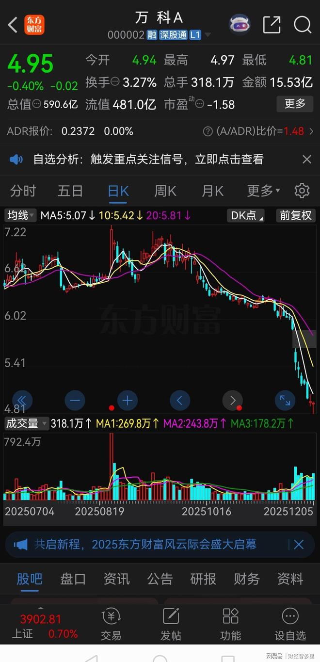 曾经的白马股,如今已经化为乌有。股价持续下跌,持有十年的投资者全部陷入困境。这只股票就是万科。公司发行价为1元。 1991年1月29日上市,是最早在A股市场上市的公司之一。其核心业务为房地产开发及相关物业经营和物业服务。万科是中国房地产行业的龙头企业、中国最响亮的品牌房地产开发商、房地产行业的领跑者。由于公司业绩一直比较好,年营收上千亿,净利润上百亿,而且近年来分红丰厚,成为很多投资者价值投资的典范,很多股东长期投资。然而,随着房地产崩盘,万科持续陷入债务危机,业绩也随之下滑。开始遭受重大损失。 2024年,其归属于母公司的净利润为亏损494.8亿元,同比下降506.81%。今年三季度,其净利润又亏损280.2亿元,同比下降56.14%。今年以来,股价一路下跌,义无反顾。尤其是最近,由于很多债券的扩容,导致股价开始下跌。近期已连续11天下跌。昨日,万科股价跌至盘中低点4.81元,收盘股价报收于4.95元。再次创下近十年来的新低,较高点已下跌87%。这意味着近十年来所有入市的投资者都被困住了,无一幸存!我在网上看到一个股票投资者2023年开始建仓万科,后来被套后就全部平仓了。然而,随着万科的股票ck价格不断跌至新低,这位股票投资者越陷越深。目前他已经损失了142万多,损失率高达39.27%。他真的因这次失败而伤痕累累。河东十年,河西十年。曾经的大白马,如今已经化为碎片!如果时代要抛弃你,你也许不需要打招呼。身陷高位的投资者可能会发现很难摆脱陷阱——这就是生活。